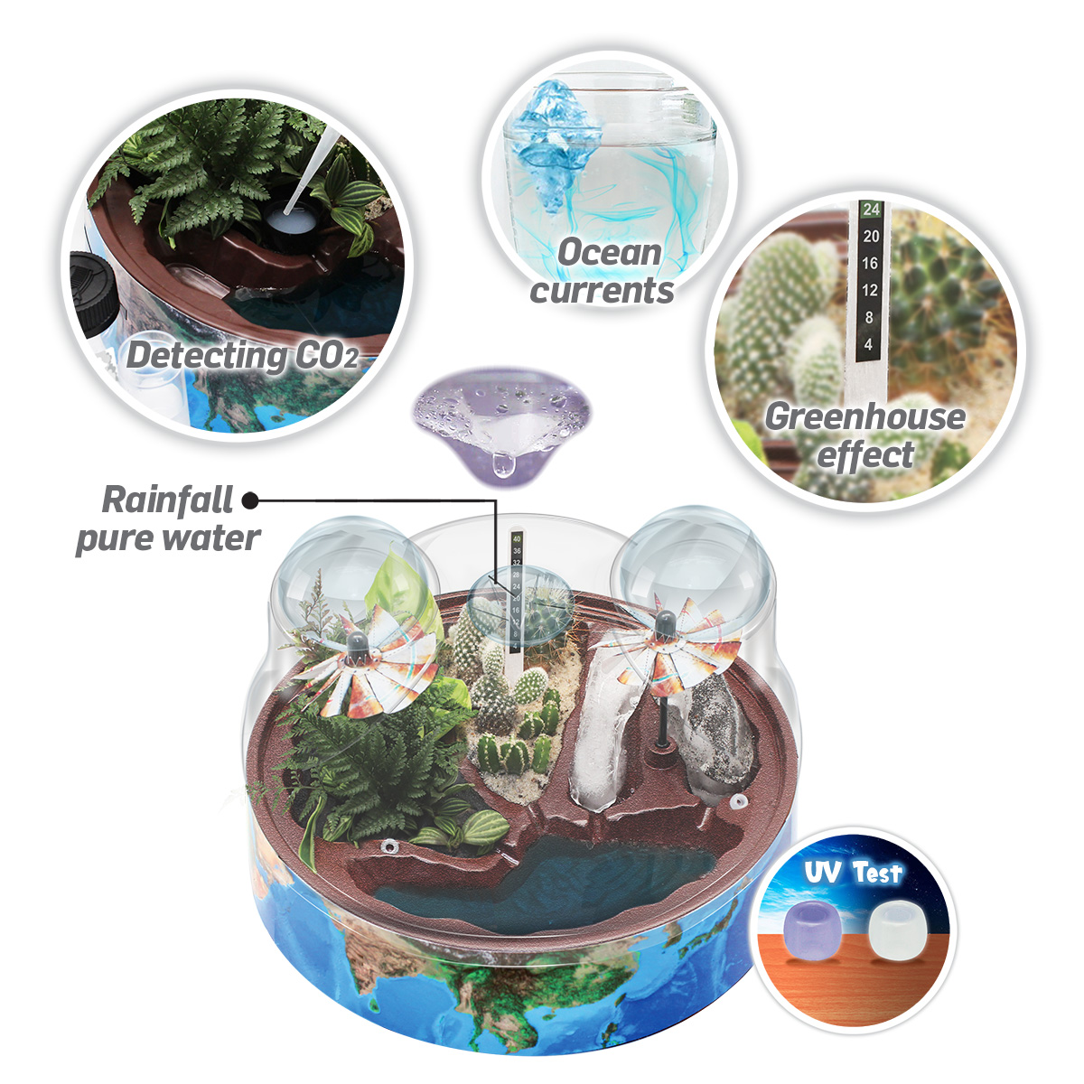 The 'CLIMATE CHANGE' kit makes sense of global weather systems and the impact of human activity. It works just like our planet and even looks like it. Use real apparatus to conduct scienti c experiments that will startle, thrill and amaze you. Grow and eat your own crops, irrigate a desert, create rainfall and see if you can save your real ice glaciers! Watch oceans rising, create and measure winds, measure carbon dioxide and acid emissions. Feel the greenhouse effect. Float icebergs and monitor ocean currents as they melt. And much much more…